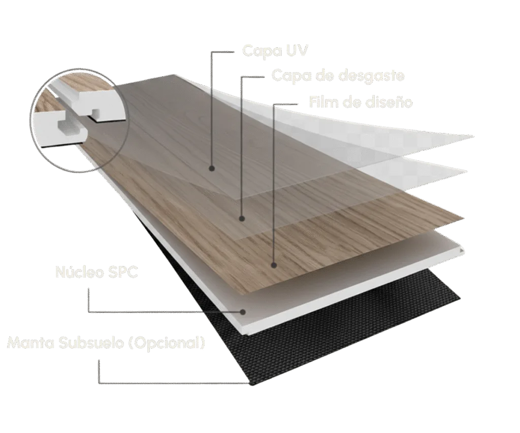 Los suelos vinílicos SPC (Stone Plastic Composite) son una solución de última generación con un núcleo ultrarresistente. Esta composición proporciona una estabilidad dimensional excepcional y una resistencia superior, ideal para zonas de alto tráfico.